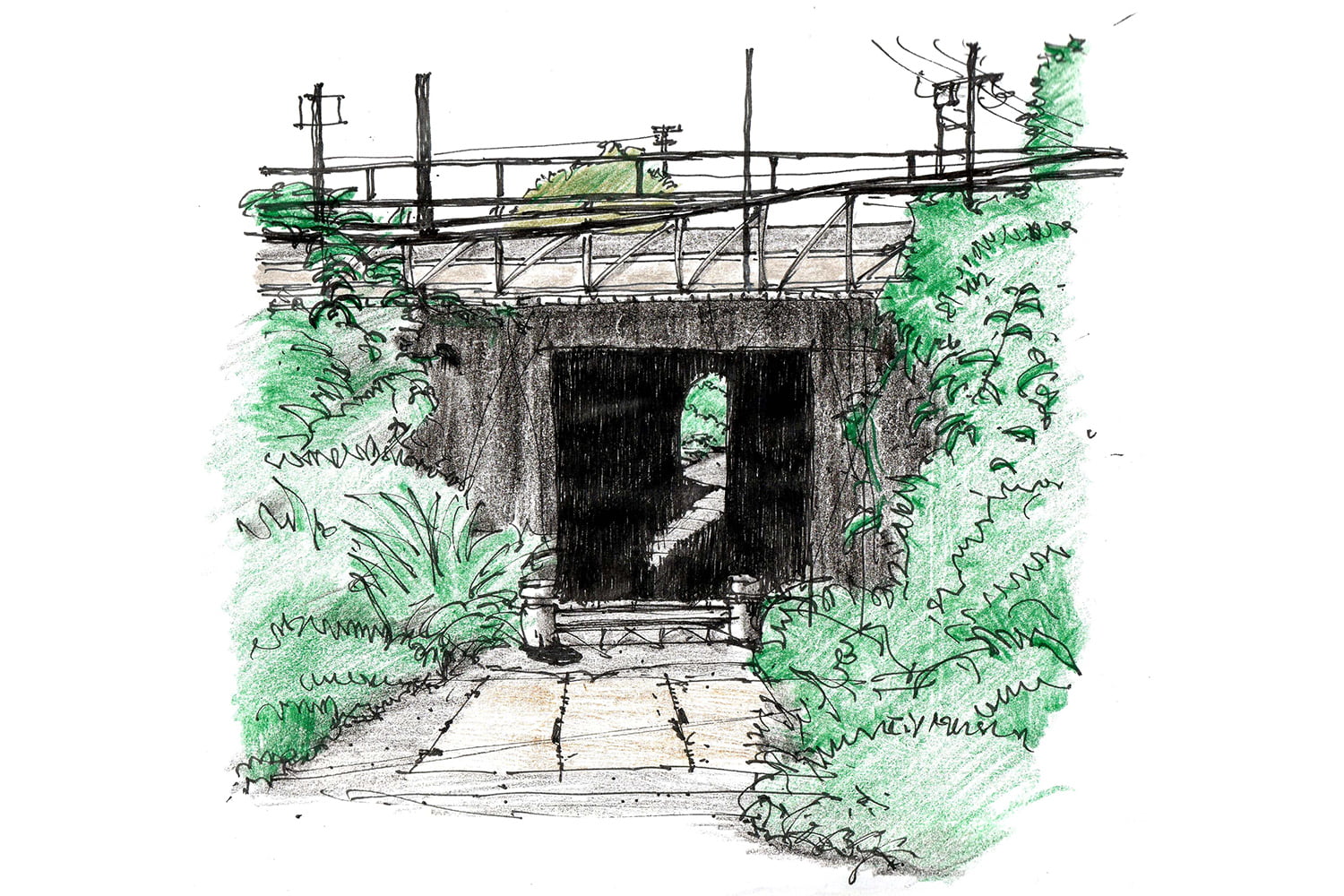 夏草に入り口を覆われたこの高架橋下の暗い通路をくぐれば隣町だ。知っているはずの町なのにここを歩いてくぐればいつもとは違う町が向こうに待っているような気がする。もしかしてこの穴は何かを変えてくれるのかもしれない。子供の頃の探検ごっこを思い出す。狭く暗いところを見つけては秘密基地にして明るいところへ飛び出しては喜んでいた。
