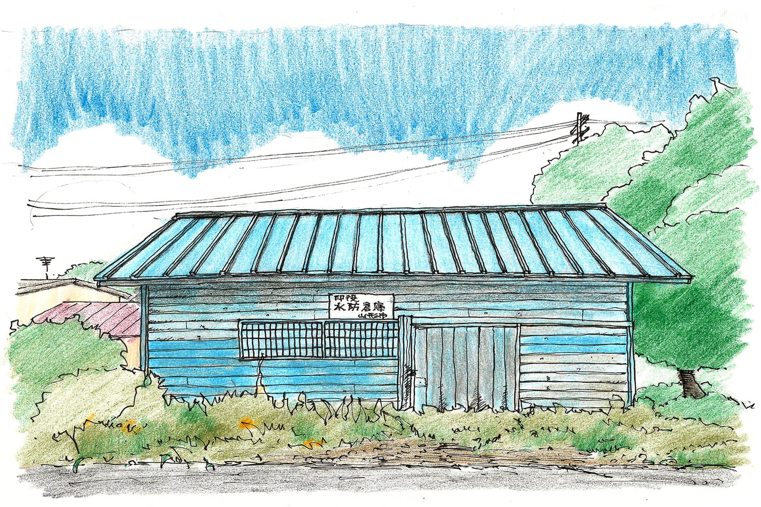 青いペンキに塗られた下見板張りのこの小さな建物に気がつく人は少ない。何年前に建てられたものかはわからないが、大正二年の「馬見ヶ崎川大洪水」以来、この地域は洪水に見舞われたことはない。しかし小さく可愛いこの水防倉庫はいつ来るかわからない水害を防ごうと長い年月じーっと川の流れと人々の生活を見つめている。